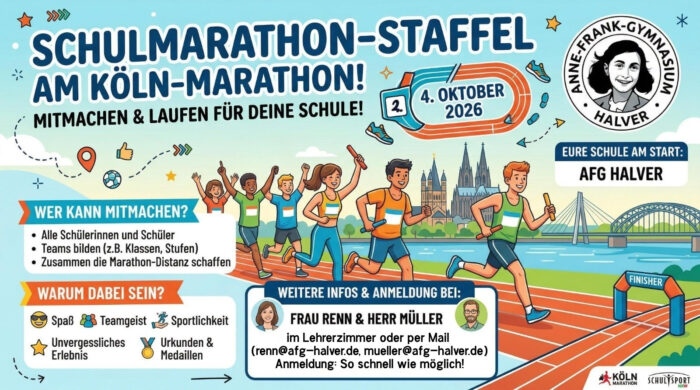 Wir begrüßen Sie auf der Homepage des Anne-Frank-Gymnasiums. Sollten Sie Inhalte vermissen oder Probleme bei der Bedienung haben, schicken Sie uns bitte eine kurze Info an webmaster@afg-halver.de.